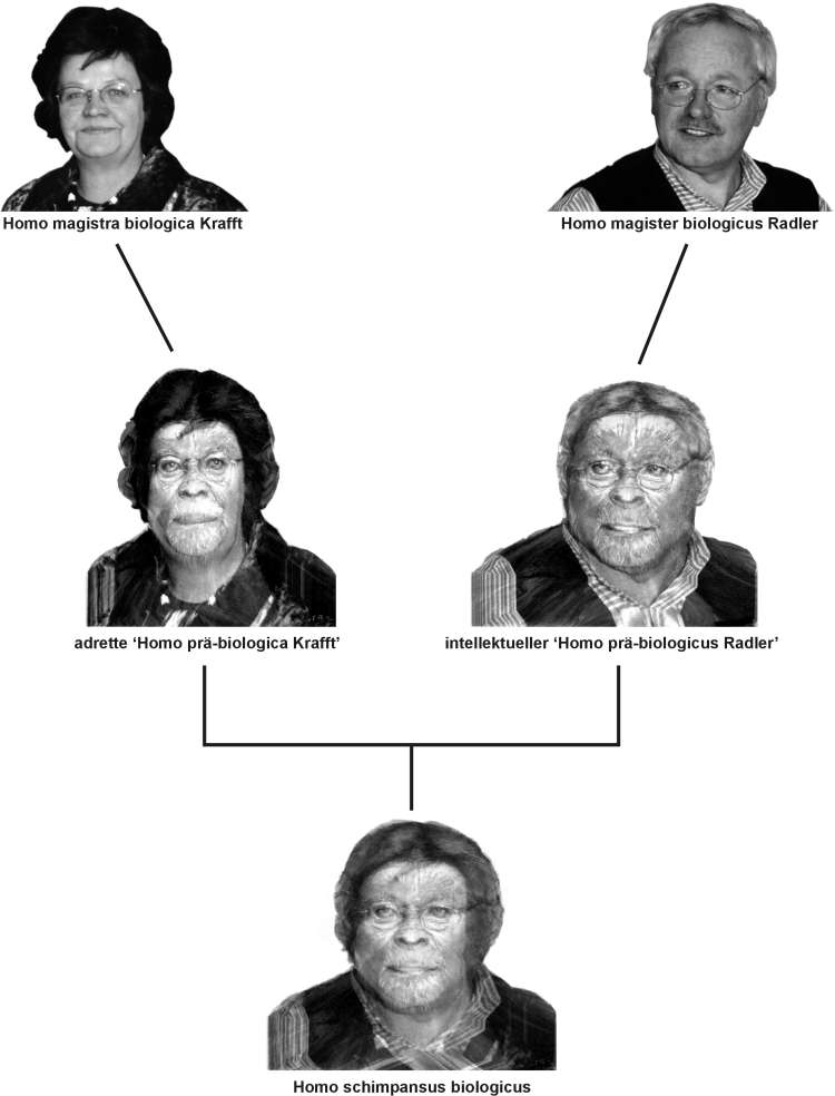 Trotz der heutzutage doch stark differenzierten Lebensweise der Lebewesen Homo magistra biologica Krafft und Homo magister biologicus Radler vertritt die Wissenschaft immer noch die These, daß beide Lebewesen einen gemeinsamen Urahn hatten. Durch aktuelle lebensnahe Studien während der letzten drei Jahre (5 Tage pro Woche bis zu 2 Stunden täglich in unmittelbarer Nähe zu den Forschungsobjekten) konnten die mit dem Projekt vertrauten Forscher (getarnt als unwissende Schüler) unter Einsatz ihres Lebens total neuartige Erkenntnisse über die bisher relativ unbekannten ‘possierlichen’ Biologielehrer sammeln. Die einzigartigen Forschungsergebnisse eröffnen uns eine völlig neue Perspektive und ermöglichen es endlich, die aufgestellte These zu verifizieren: